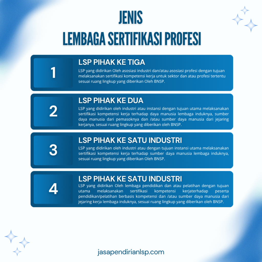 Lembaga Sertifikasi Profesi (LSP) adalah organisasi yang bertugas untuk melakukan sertifikasi terhadap kompetensi tenaga kerja di berbagai bidang. LSP berperan penting dalam memastikan bahwa individu yang memiliki sertifikat telah memenuhi standar kompetensi yang ditetapkan.